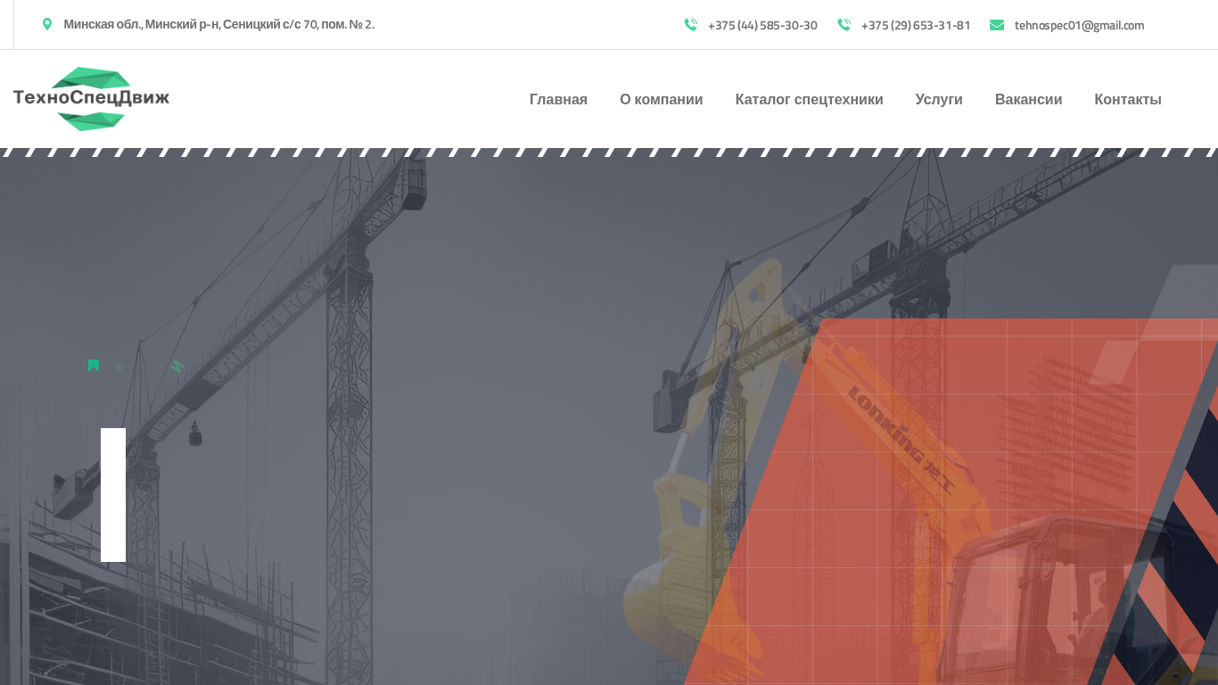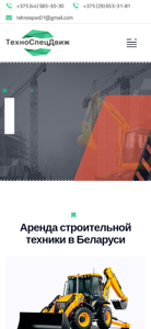 | AI-анализ | --- This website is an equipment rental service based in Minskaya oblast, Mininsky r-n, and Seditsky s/s 70, Pom. № 2. The contact information includes phone numbers +375 (44) 585-30-30 and +375 (29) 653-31-81, and email address tehnospec01@gmail.com. The main sections of the site are 'О компании' (About Company), 'Каталог спецтехники' (Catalog of Special Equipment), 'Услуги' (Services), 'Вакансии' (Vacancies), and 'Контакты' (Contacts). The company offers equipment rental in various types including excavators-loader cranes, hydromilling machines, manipulators, mini-exc |
