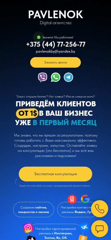 | AI-анализ | This online resource, Pavlenok - Digital агентство, offers services to bring clients to businesses for as little as $1 within the first month. The agency specializes in creating websites, landing pages, and quizzes. They are also equipped to set up contextual advertising on Yandex and Google, as well as targeted advertising on Instagram, TikTok, Vkontakte, and Ok.net. Visitors can request a consultation, which is free, or leave their phone number to receive a call back. The agency also includes links to their presence on Telegram, WhatsApp, and Viber. The domain is registered with Tilda. |