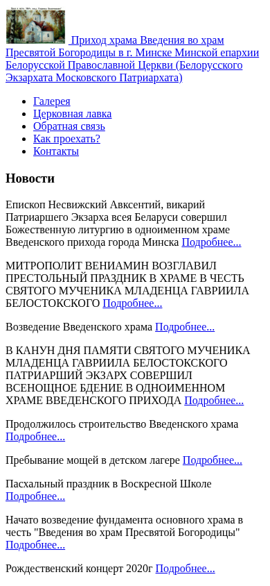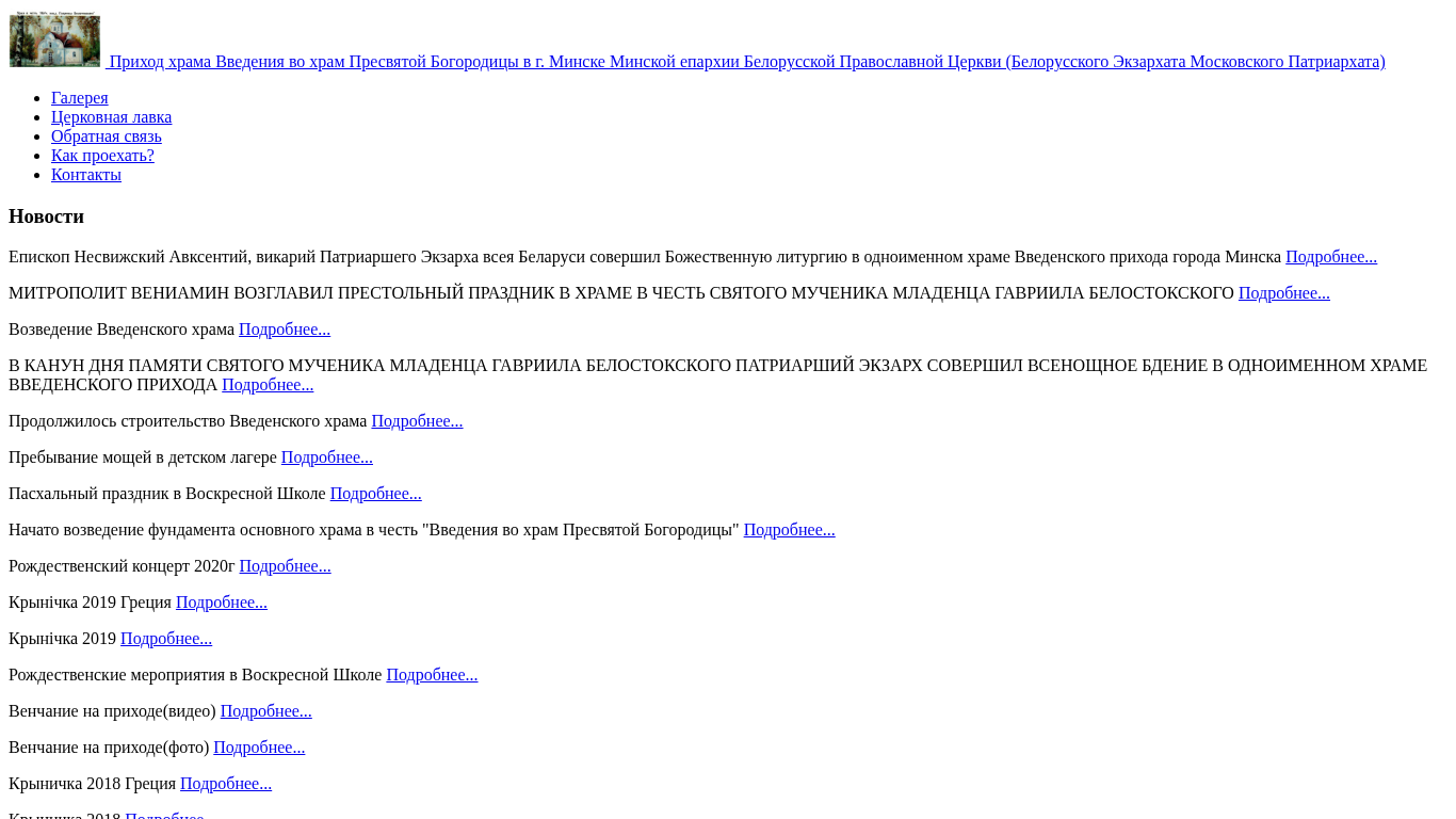 | AI-анализ | The portal vvedeniebogorodici.by is a website for the Orthodox Christian community of the Church of Belarusian Orthodox Church (Belarusian Exarchate of the Moscow Patriarchate), specifically for the Parish of the Vvedenie (Introduction) of the Most Holy Mother of God Church in Minsk, Belarus. The site includes news, photos, events, and information about the church, its activities, and its clergy. Topics include the introduction of the holy icon of the Mother of God, Sunday schools, children's camps, feast days, and construction projects. The site also features a church shop, contact information, and directions. Recent news items include the visit of Bishop Avksenty of Nesvizh, a vicar of the Patriarchal Exarchate of All Belarus, to the church for a divine liturgy, |