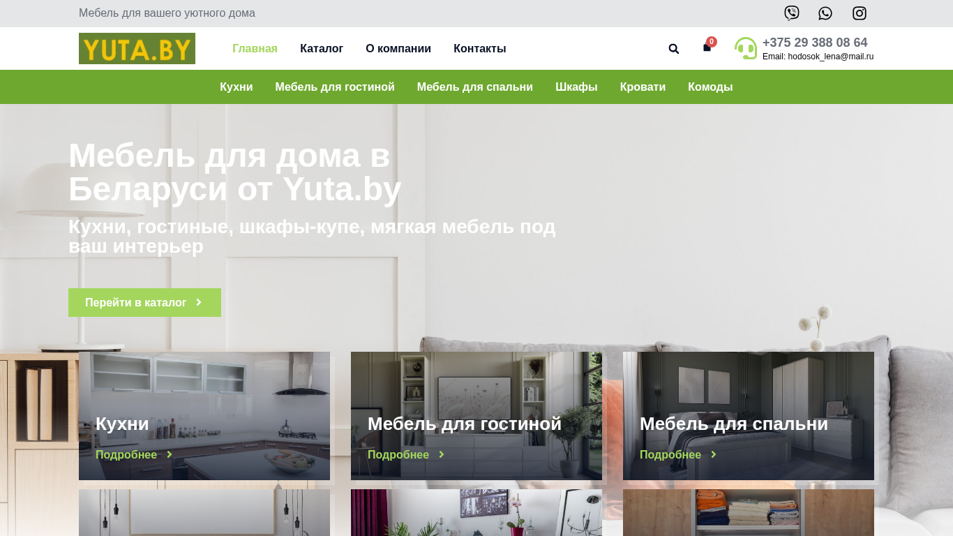| AI-анализ | --- The website Yuta.by is an e-commerce platform focusing on furniture sales for Belarusian residents. The homepage offers various categories such as kitchens, living rooms, bedrooms, and closets. Users can explore the catalog, learn about the company, and contact customer service using the provided contact information. The site is primarily composed of furniture made of LDSP (low-density fiberboard) in various colors and finishes, with a significant number of items being tumble-style wardrobes or cabinets. The site also offers ready-made kitchens and a search function for easier product selection. No products are currently in the user's cart. |