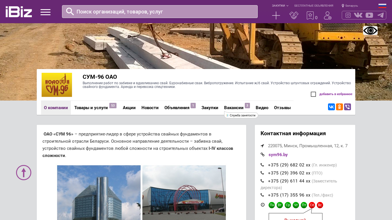 | AI-анализ | The web project "SUM-96 OAO" specializes in the execution of pile driving and driving-in of piles. It offers bored pile foundations, pile testing, and the installation of protective fencing and pile foundation structures. The company also rents and transports specialized machinery. The address is 220075, Minsk, Industrialny Prospekt, 12, apt. 7. |