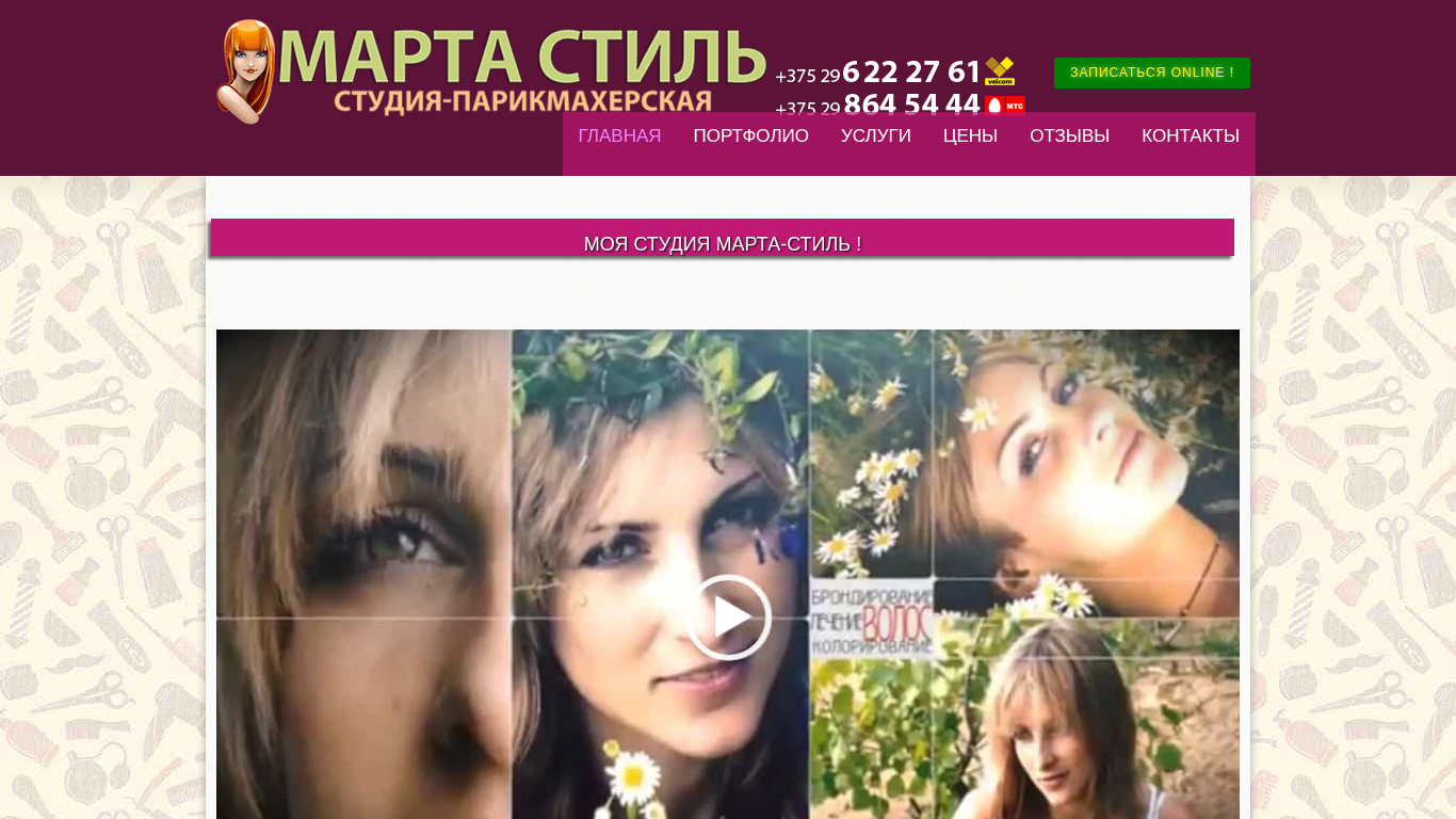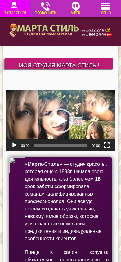 | SEO-описание | Салон парикмахерская – Марта Стиль (Минск ул. Кирова 19), все виды парикмахерских услуг. Модные мужские и женские стрижки и уход за волосами по доступным ценам. Акции, скидки. Онлайн запись. |
