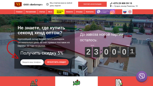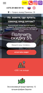 | AI-анализ | The website is an e-commerce platform for second-hand goods, specifically clothing, operated by OOO "Vibotorg" in Belarus. The company offers a large selection of second-hand items from Europe for sale at low prices. Customers can purchase second-hand items in Minsk and other cities in Belarus. The website provides a Viber contact for inquiries and offers consultations. The company has been in business for over 20 years and offers a 5% discount. The remaining time before the next new shipment is displayed on the website, along with the amount of stock (over 200 tons) and various product categories such as shoes, outerwear, shirts, jeans, and accessories. The website is the exclusive representative of 12 leading European factories, offering over 400 product names. Customers can receive SMS notifications about new arrivals |