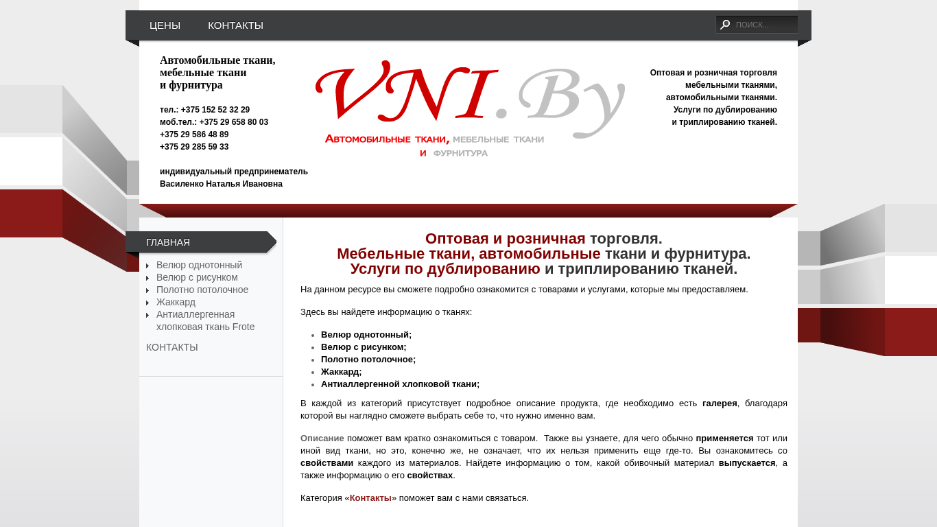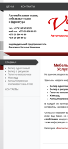 | AI-анализ | This website is an e-commerce platform selling various types of fabrics, including auto and furniture materials. The title is "Главная" (Main), and the description is absent. The keywords include "контакты" (contacts), "велюр" (velour), "ткани" (fabrics), "тел." (phone), "тканями" (with fabrics), "главная" (main), "автомобильные" (auto), "мебельные" (furniture), "фурнитура" (furniture accessories), "152", "658", "586", "наталья", "ивановна", "оптовая" (wholesale), "розничная" (retail), "торговля" (trade), and "услуги |