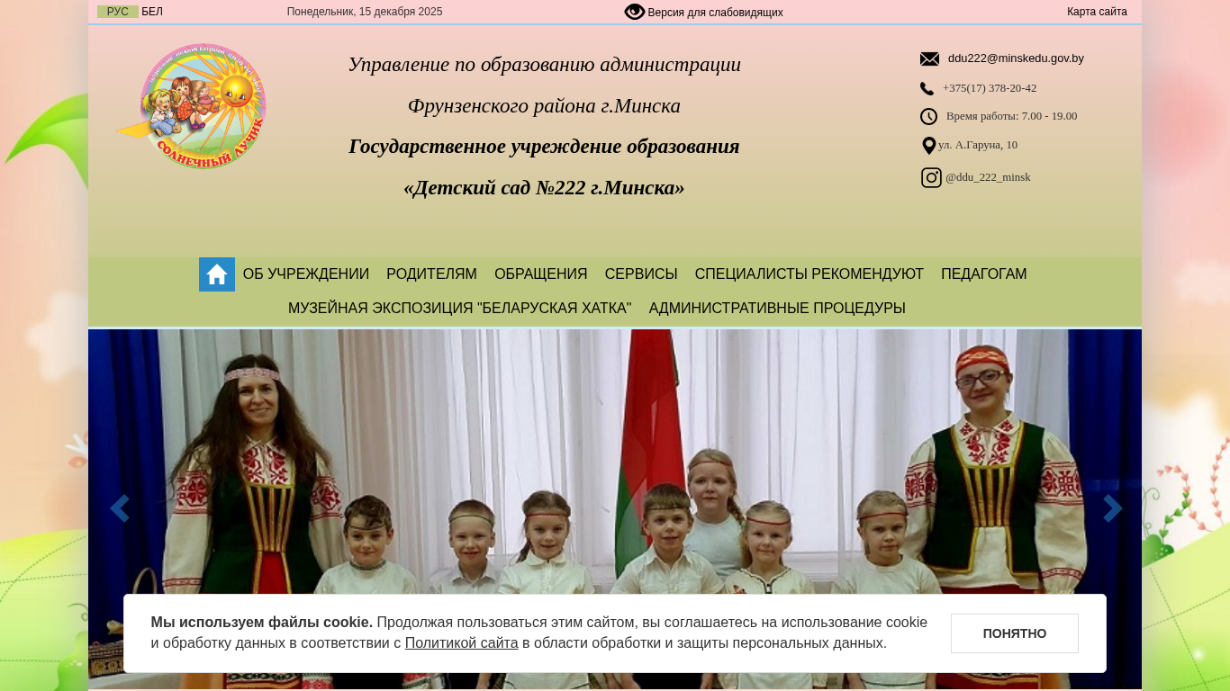 | AI-анализ | This website belongs to the State Educational Institution 'Detsky sad №222 g.Minsk' (Children's kindergarten №222 in Minsk). The title of the website is 'Детский сад № 222 г.Минска' (Detsky sad №222 g.Minsk) and it contains information about the kindergarten, its administration, educational services, and policies. The top words on the website indicate that it relates to 'education' with a focus on 'Minsk' and 'kindergarten'. Keywords include 'kindergarten', 'education', 'Minsk', and 'administration'. The website offers educational services on a fee-basis and provides information about the kindergarten's policies on data protection, labor safety, and assistance for disabled individuals. The contact information for the |
