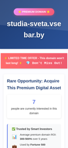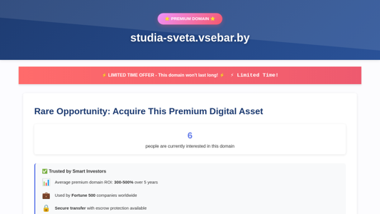 | AI-анализ | This online resource, titled "studia-sveta.vsebar.by," offers a premium domain available for acquisition. The website indicates that this domain is a limited time offer and that interested parties should submit their premium offers. According to the information provided, the domain has already garnered interest from six individuals. The domain is described as a premium digital asset and is trusted by smart investors, with an average return on investment of 300-500% over five years. The domain has been used by Fortune 500 companies and comes with secure transfer and escrow protection. The website encourages serious inquiries and competitive offers, with priority consideration given to those over €500. The domain is described as an appreciating asset, marketing power, SEO advantage, instant credibility, and a competitive moat. The transfer process is secure and professional, with a verified ownership and fast processing. |
