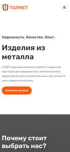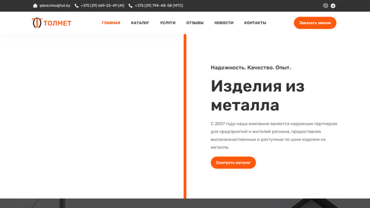 | AI-анализ | --- This online resource, titled "Главная страница - Толмет," offers various metal-related products and services. The description mentions 'металлоизделия' (metal products) numerous times, along with categories like 'беседки' (benches), 'навесы' (canopies), 'качели' (chairs), and 'контейнеры для мусора' (garbage containers). Additionally, 'металлопрокат' (metal processing) and related services, such as 'Рубка (резка) металла' (cutting metal), are available. The website also includes a catalog, contact information, and news section. |