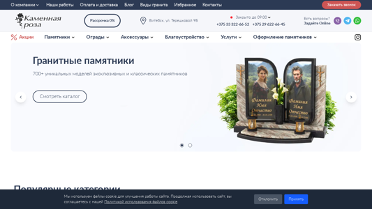 | AI-анализ | This website is for Каменная Роза, a granite memorials production and installation company based in Vitsebsk, Belarus. The website offers a range of granite monuments, memorial complexes, ogras, and accessories for sale. The company emphasizes quality, reliability, and individual approach. The top keywords are 'memorials', 'granite', 'ogras', and 'accessories'. The website features a blog, catalogs of ready-made monuments, and various materials and accessories for sale. The company also offers delivery and financing options. The website is open from Monday to Saturday, with lunch breaks and closed on Sundays. The contact information includes two phone numbers and an online contact form. |