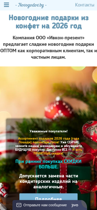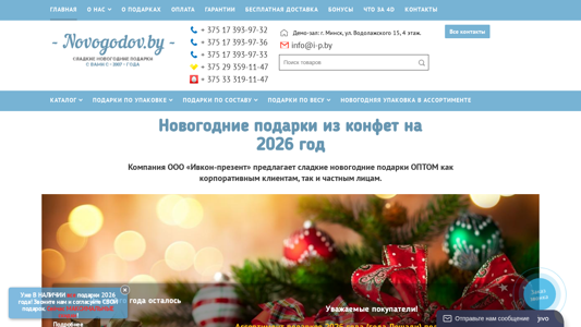 | AI-анализ | This website, titled "Новогодние подарки конфет для детей с доставкой Ивкон-Пrezent," offers sweet New Year's gifts in the form of candies and delivers them throughout Belarus. The product range includes gifts for children and adults, including corporate sets, in various packaging options such as carton, leather, tin, and wooden boxes, tubes, and textile mesh. The company, OOO "Ивкон-презент," provides these gifts both for corporate clients and private individuals. The assortment for the upcoming New Year (Year of the Horse) is ready, and customers are encouraged to contact their managers for purchases. There are also attractive discounts for early purchases. The catalog includes various categories of gifts based on packaging and size, with options for gifts under 400g, 400-600g, |