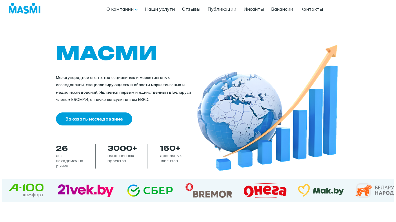 | AI-анализ | This online resource, titled "MASMI," is an international social and marketing research agency specializing in market and media research. Established in 1995, the company has been operating for over 26 years and has completed over 3000 projects for more than 150 satisfied clients. MASMI is the first and only member of ESOMAR in Belarus and a consultant for the European Bank for Reconstruction and Development. The agency offers quantitative and qualitative research services, with a focus on understanding what truly matters and providing solutions to clients' challenges. MASMI maintains an open dialogue with clients, prioritizing their needs and ensuring confidentiality. The team consists of experienced professionals committed to delivering high-quality results in a timely manner. The company's principles include passion for the work, reliability, and a dedication to creating a friendly working environment. MAS |