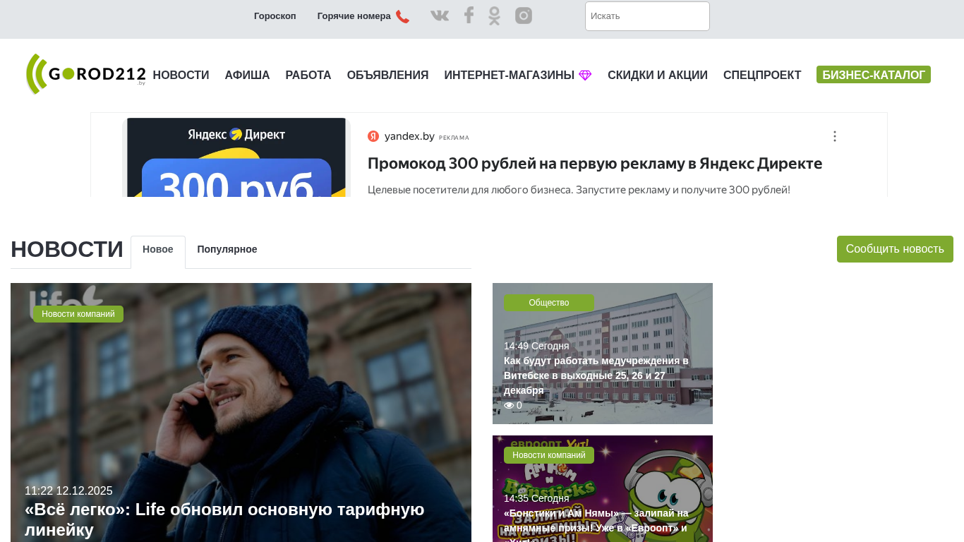 | SEO-описание | Городской портал Витебска. Новости, реклама, объявления, афиша мероприятий, работа, вакансии, резюме, скидки и акции, спецпроекты. Только самые актуальные новости. Прогноз погоды, расписание транспорта, гороскоп всех знаков зодиака на сегодня. экстренные службы и горячие номера, курсы валют. |