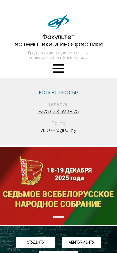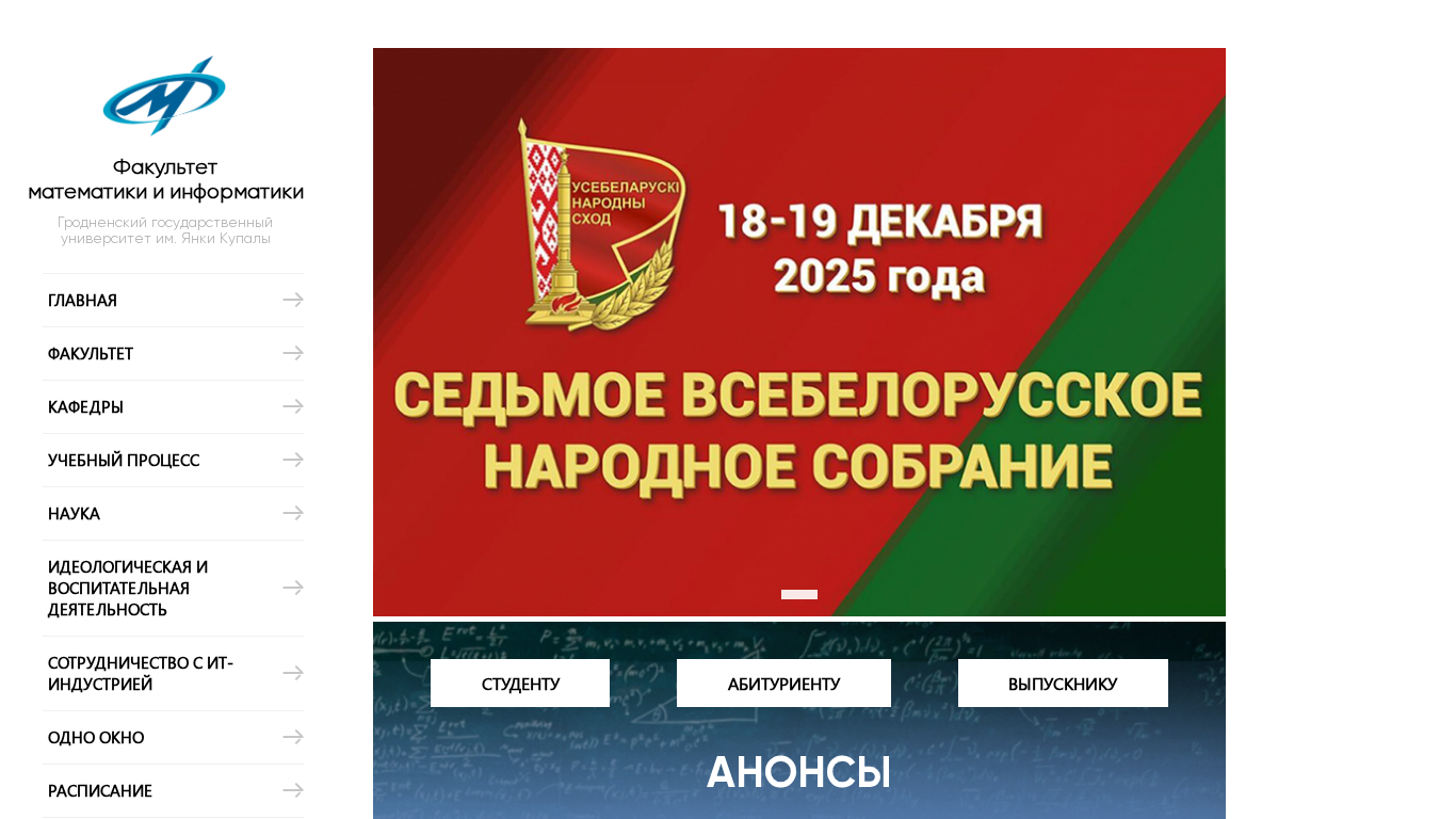 | AI-анализ | This online resource is the homepage of the Faculty of Mathematics and Informatics at the Grodno State University named after Yankee Kupala in Belarus. The website provides information about the faculty's structure, specialties, dean, goals and objectives for the period 2021-2025, history, notable alumni, faculty council, coordinating council for personnel training, methodological commission, and various events such as seminars, research activities, and conferences for students and scholars. The website also includes information about academic programs, academic process, and scientific research. Keywords associated with this site include 'faculty', 'students', '2025', 'faculty', 'mathematics', 'informatics', 'Grodnenский', 'янки', 'купалы', 'совет', 'company', 'companies', 'и |