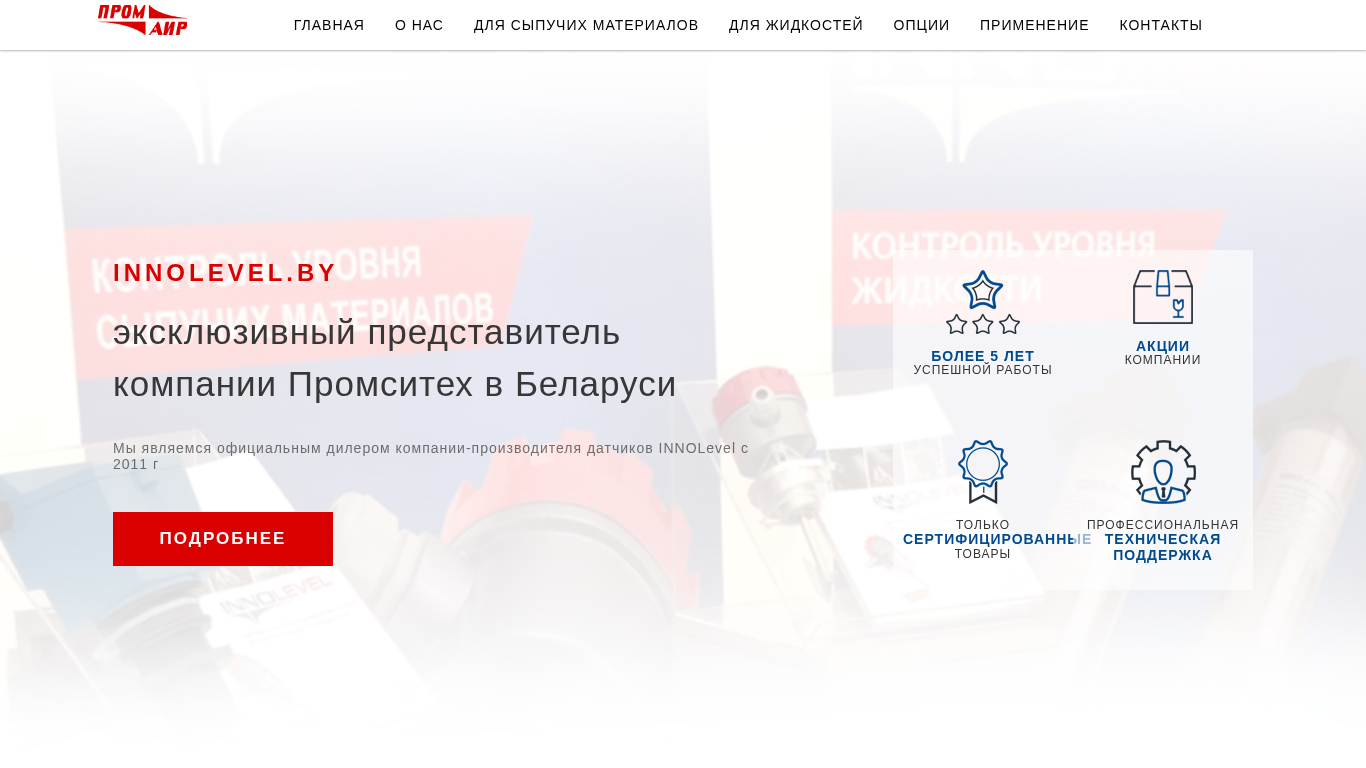 | SEO-описание | Купить датчики уровня InnoLevel Вы можете в магазинах ООО ПРОМАИР, эксклюзивного представителя компании Промситех в Беларуси. Официальный дилер компании-производителя продукции INNOLevel в стране. |