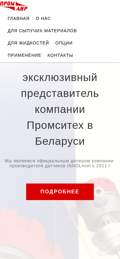 | AI-анализ | The website is an exclusive representative of InnoLevel products in Belarus, located in Minsk. Customers can buy InnoLevel level sensors from OOO PromAir, the company's official distributor. The website provides information on InnoLevel's offerings for both dry and liquid materials, as well as various options for the sensors. It has been operating successfully for over 5 years and only sells certified products. The website offers a wide selection of level sensors and options for them, including INNOLevel N, INNOLevel-M, INNOLevel Vibro-U, INNOLevel Vibro-A, INNOLevel Optic, INNOLevel Echo for dry materials, and INNOLevel Vibro-A, INNOLevel Vibro-U, INNOLevel Optic for liquid materials. Various options for the |