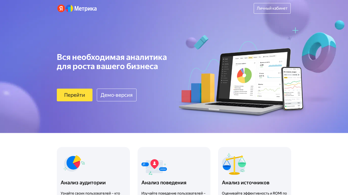 | AI-анализ | This website, titled "Яндекс Метрика – бесплатная система аналитики для роста бизнеса в онлайн" (Yandex Metrics - a free system for business growth analysis in online), is a platform for understanding users and their behavior on a website, as well as evaluating the effectiveness of channels for attracting traffic. The website offers various analytical tools, including audience analysis, behavior analysis, and analysis of sources. Users can evaluate the effectiveness of marketing efforts across the entire path from advertising to purchase, and make quick and effective decisions based on the data. The website also includes tools for optimizing online advertising and is specifically geared towards electronic commerce. The platform is provided by OOO "Яндекс" and is available in a demo version. |