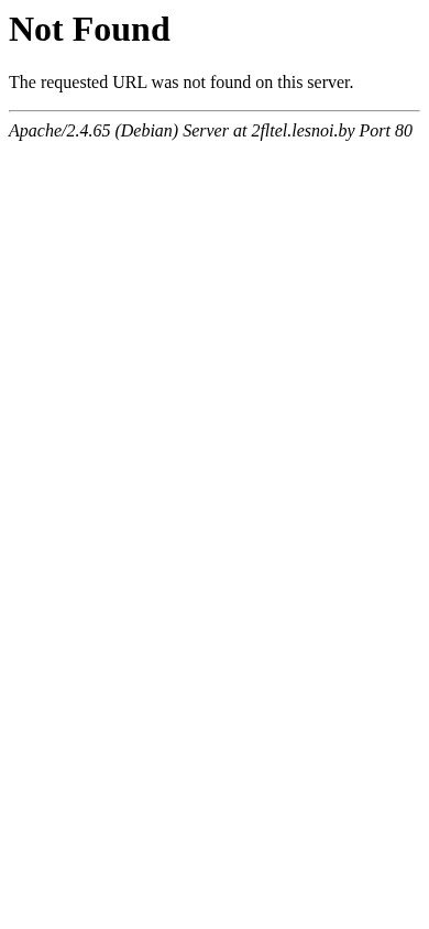 | AI-анализ | The portal 2fltel.lesnoi.by displays a standard 404 error message when an incorrect or non-existent URL is requested. The error message states that the requested URL was not found on the server. The server software in use is Apache 2.4.65 running on a Debian operating system. |