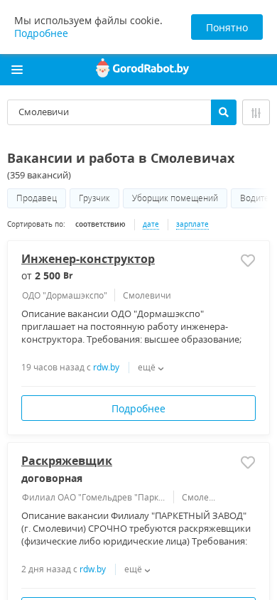 | SEO-описание | Ищете работу в Смолевичах? На нашем сайте Вы найдете более 359 свежих вакансий от прямых работодателей. Быстрый и удобный поиск вакансий с ГородРабот.бай |