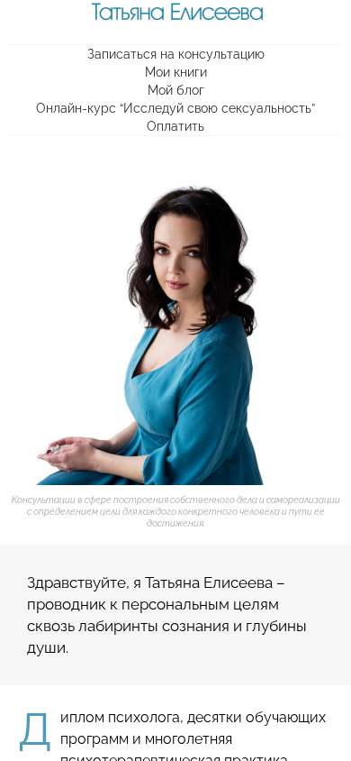 | AI-анализ | --- This online resource belongs to Tatiana Eliseeva and is named after her. The website primarily focuses on providing consultations in the areas of personal goal setting and self-realization. Visitors can book consultations, view Tatiana's books, follow her blog, and enroll in her online course titled "Explore Your Sexuality." The platform offers consultations for individuals to determine their personal goals and the paths to achieving them. Tatiana Eliseeva is a psychologist, with numerous educational programs and a long therapeutic practice background, making her a curious investigator and guardian of human secrets. Her degrees in law and finance, along with her experience in commercial banks, have given her a clear understanding of the interconnectedness of various aspects of life. She teaches herself to dance and paint and enjoys an active lifestyle, including cycling, yoga, swimming, and walks. She has experience appearing on radio |