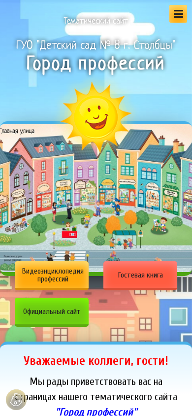 | AI-анализ | This online resource is a website for "Город профессий" (City of Professions) of "Детский сад № 8 г. Столбцы" (Child Care Center No. 8 in the city of Stolbtsy), which is part of the educational system in Belarus. The site includes an archive of news, and its keywords indicate that it is related to the Ministry of Education in the Republic of Belarus. The main content of the site consists of various sections dedicated to different professions, such as auto mechanic, actor, military doctor, journalist, cosmonaut, policeman, musician, shoemaker, cook, postman, salesperson, hairdresser, builder, trainer, tour agent, farmer, painter, tour guide, and seamstress. The site also features a video encyclopedia of professions, multifilms about |