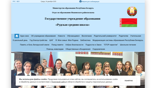 | AI-анализ | --- This online resource is a website for Rudskaia Sredniaia Shkola (Rudskaia Middle School) located in Ivanovskii Raion, Belarus. The title of the website is "Рудская средняя школа Ивановского района" (Rudskaia Sredniaia Shkola Ivanoўskoho raionu). The description of the website mentions the use of cookies and provides a link to the site's privacy policy. The keywords and top_words indicate that the website provides information about the school's schedule, works, educational programs, events, and rules, as well as reports and plans. The school's name and location are also mentioned in the description. The domain name is rud.ivanovo.edu.by. |