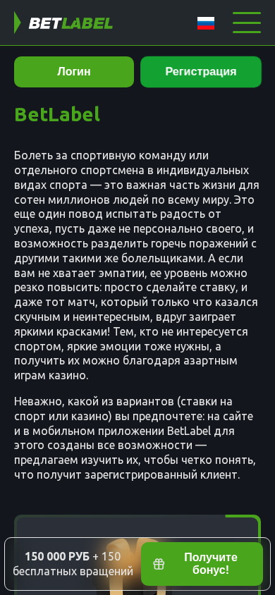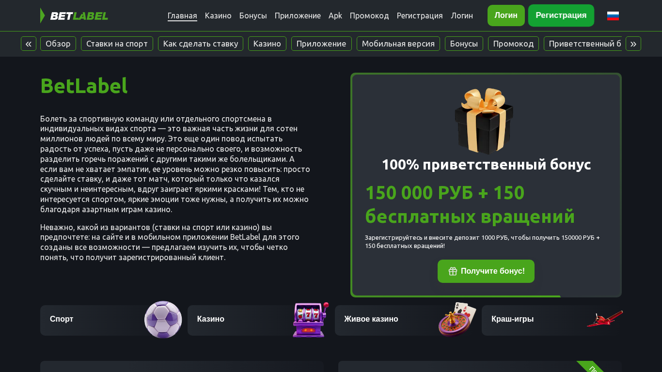 | SEO-описание | BetLabel — ваш новый букмекер и онлайн-казино. Делайте ставки, вращайте слоты, играйте в live-игры — на сайте и в мобильном приложении! Приветственный бонус 150000 РУБ. |