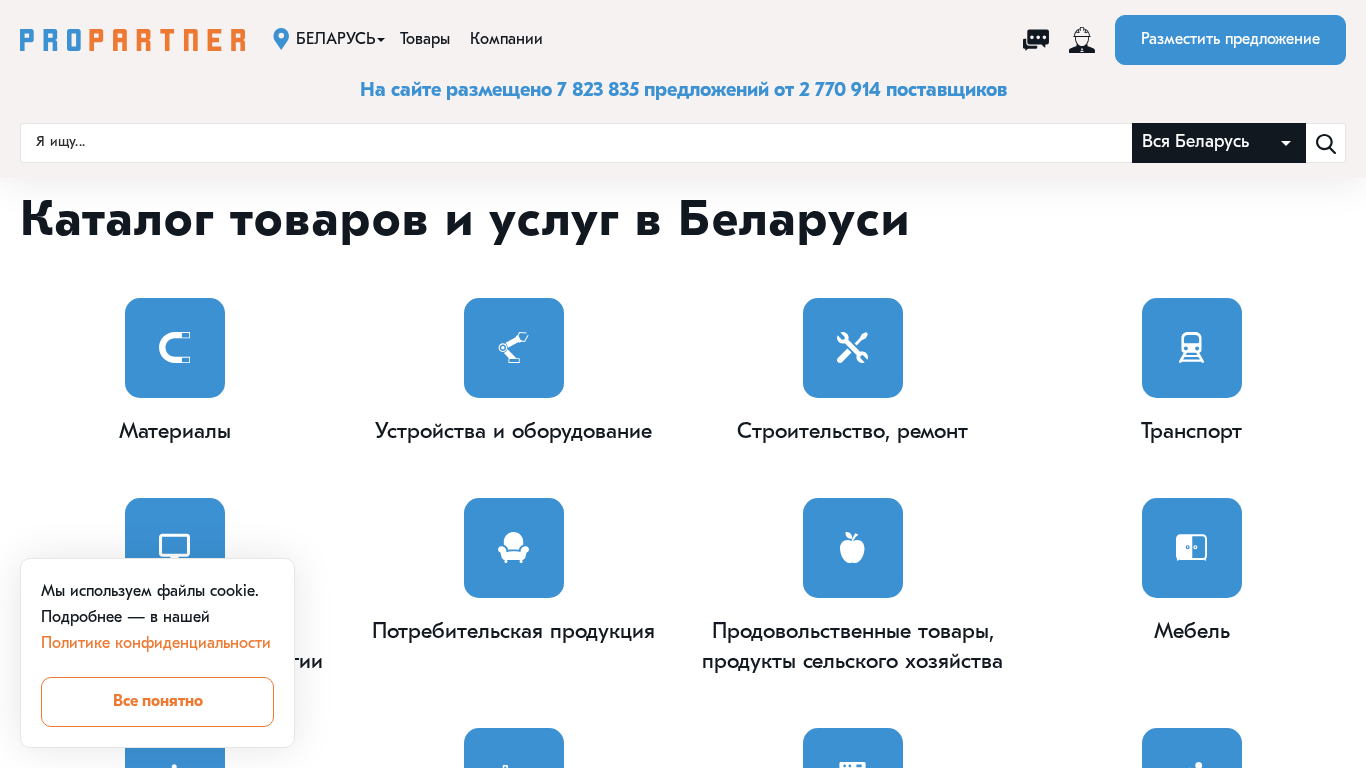 | AI-анализ | This online resource is a business catalog for companies, products, and services in Belarus. ProPartner.ru offers a platform for manufacturing, industrial, and trading enterprises, suppliers, factories, and organizations in the service sector. Companies can publish price lists, product and service information, and register for free on the site. The catalog includes a search function for goods and services, tenders and procurement, and a free company website creation service. Keywords associated with the site include 'Belarus', 'goods', 'services', 'companies', 'business', 'sales', 'transactions', 'purchases', 'tenders', 'information about companies', 'prices', 'wholesale', 'buy', 'catalog', 'pricelist', 'directory', 'B2B'. The site contains over 7,823,835 offers from 2 |