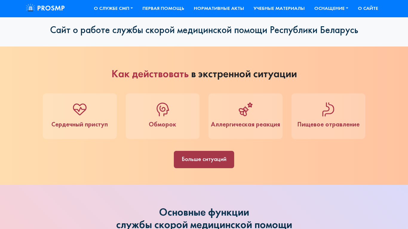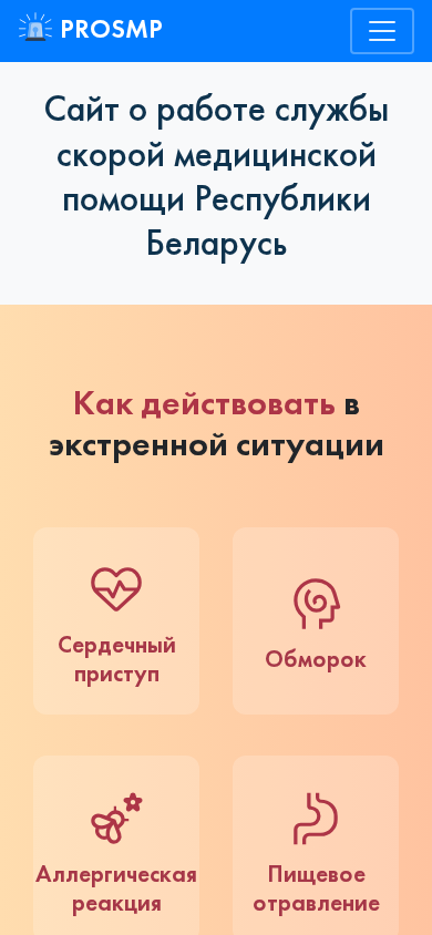 | AI-анализ | This website is dedicated to the work of the Emergency Medical Services (EMS) in the Republic of Belarus, specifically titled "PROSMP – скорая помощь Республики Беларусь" (PROSMP – Quick Help of the Republic of Belarus). The description provides information on the functions, organization, and operations of the EMS, including documentation requirements, emergency response for foreign citizens, a list of EMS stations, and interactive maps. The site also offers a question-and-answer section, first aid instructions, and information on normative acts and educational materials. The website is operated by PROSMP and offers guidance on how to act during emergencies, such as heart attacks, fainting, allergic reactions, and food poisoning. The site does not provide services like issuing medical certificates, writing prescriptions, or performing medical examinations. The main functions of the E |