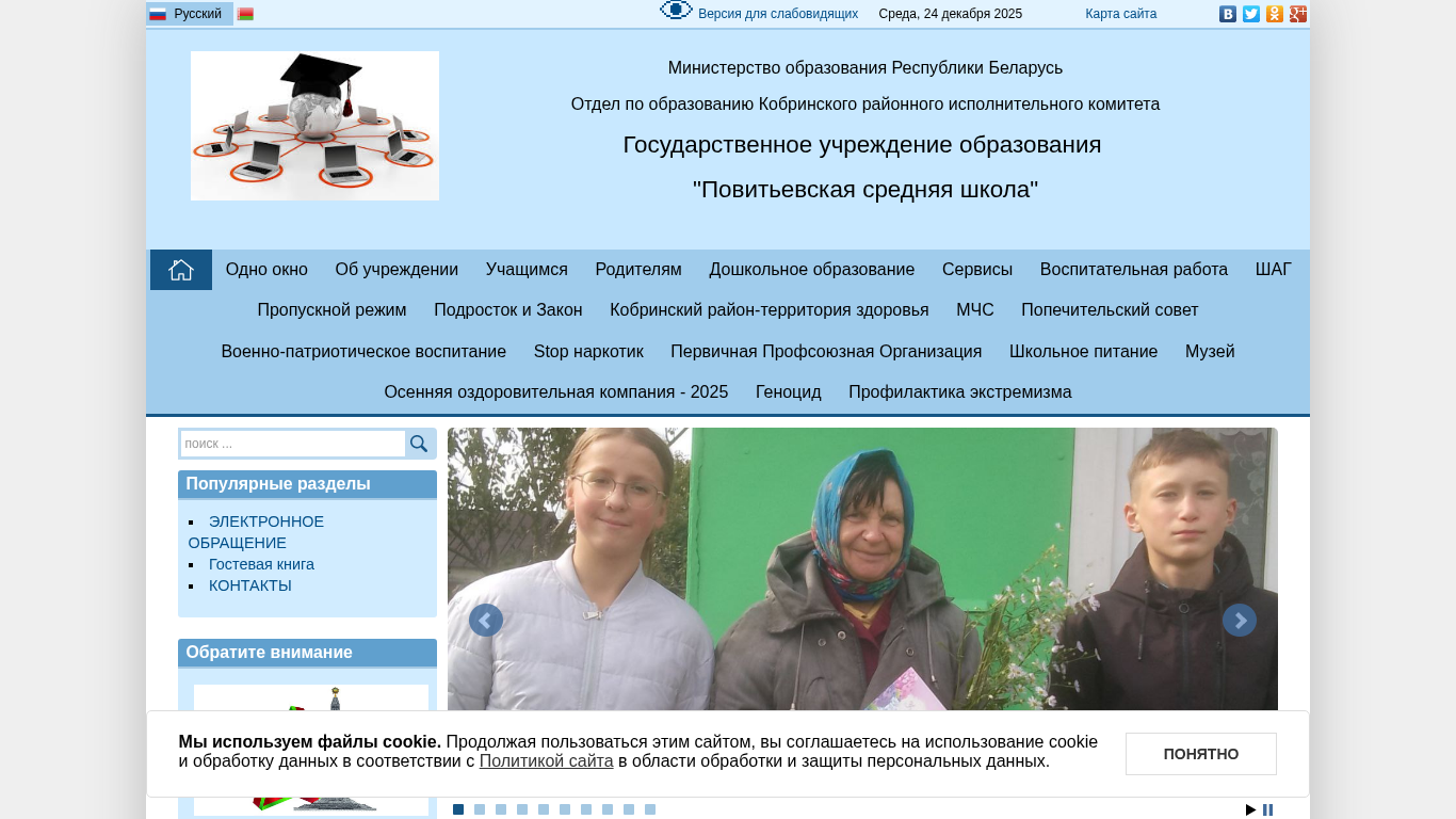| AI-анализ | --- This online resource is the official website of "Повитьевская Средняя Школа" (Povityevskaya Srednyaya Shkola) located in the Cobrin district of Belarus. The website provides information about the school, its mission, educational programs, services, and contact details. Keywords related to the website include "education," "children," "school," and "Kobrinsky rayon." The most frequently used words on the site are "2025," "read," "further," "education," "Belarus," and "site." The website is operated by the Ministry of Education of the Republic of Belarus and the Cobrin District Executive Committee. It includes sections for parents, early childhood education, school services, educational activities, health and safety, and a school council. The site also features information on various school initiatives, such as military |