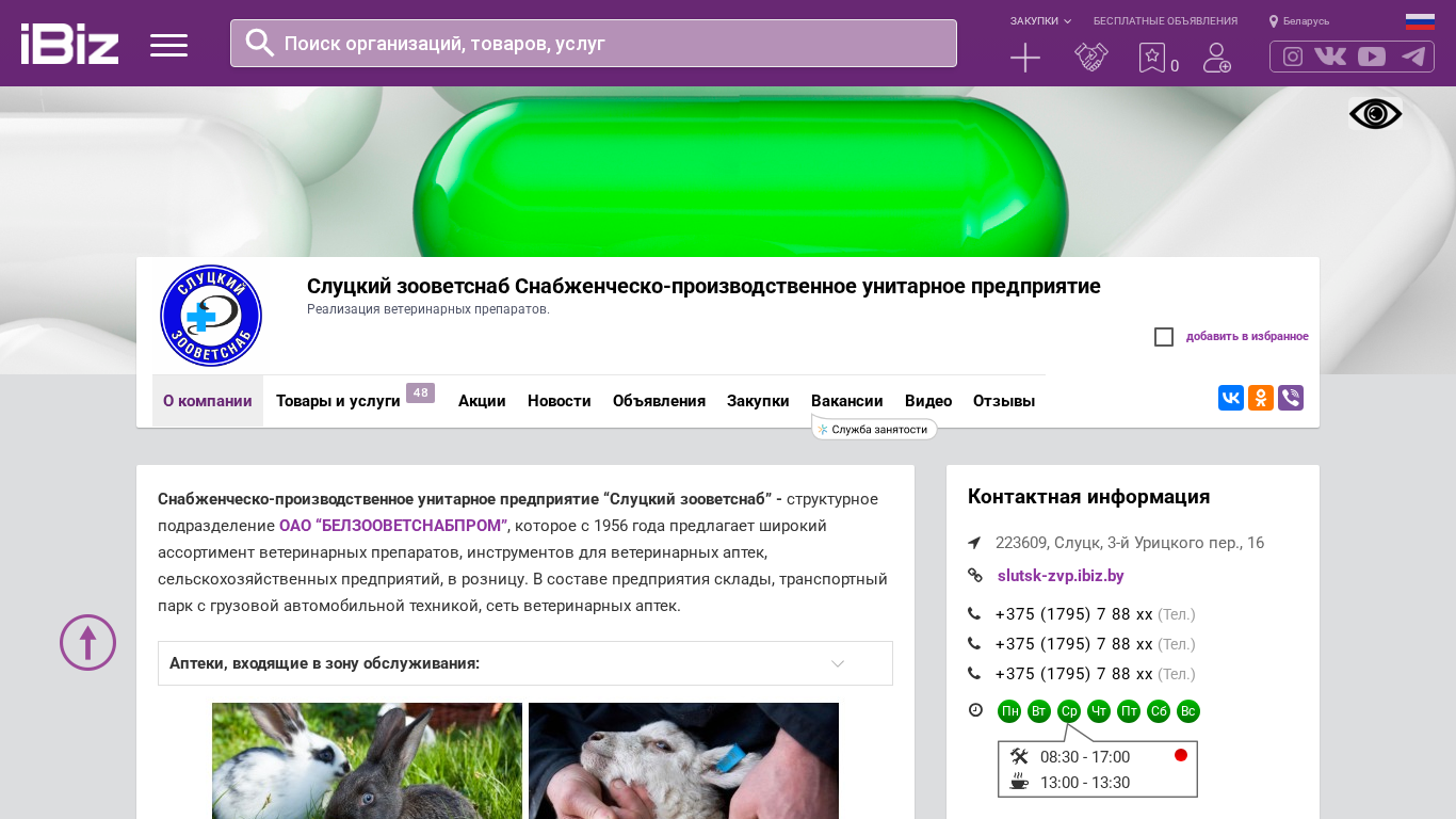 | AI-анализ | <!DOCTYPE html> <html lang="ru"> <head> <meta charset="UTF-8"> <title>Слуцкий зооветснаб Снабженческо-производственное унитарное предприятие - Реализация ветеринарных препаратов..</title> <meta name="description" content="Слуцкий зооветснаб Снабженческо-производственное унитарное предприятие - Реализация ветеринарных препаратов.. Полная информация о компании, товарах и услугах, контактах и схеме проезда."> <meta name="keywords" content="ветеринарные препараты, препараты, ветеринарные, |