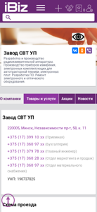 | AI-анализ | This online resource is a website for Завод СВТ УП, a company based in Минск, Belarus, located at Независимости пр-т, 58, к. 11. The website primarily focuses on the development and production of radio measuring equipment, as well as the manufacturing of measuring instruments, electronic components, and electronic boards. The company also offers software development services and repairs for both electronic and optical equipment. The website includes sections for company information, products and services, news, and job vacancies. The contact information provided includes several phone numbers for different departments and the company's UNP number. The website is in the "Controllable-measuring instruments and systems" category on Yandex and is open for business from Monday to Friday, 08:00 to 16:30, with lunch breaks from 11:30 to |