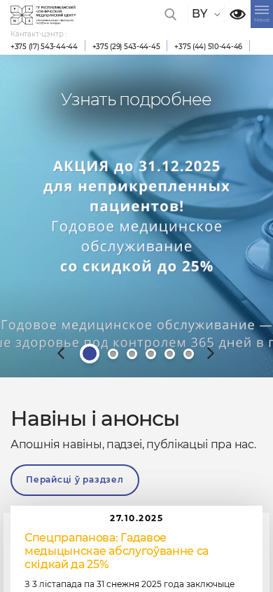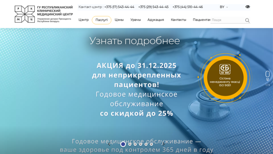 | AI-анализ | The web project "Republican Clinical Medical Center under the Management of the President of the Republic of Belarus" offers a range of medical services, including cardiology, cardiothoracic surgery, laser microsurgery, vocal procedures, implantation of artificial heart valves, minimally invasive surgery for intervertebral hernia, and rehabilitation programs after an injury and COVID-19. The site provides information on the latest news, announcements, and special offers such as a 25% discount on certain medical programs from November 3 to December 31, 2025. Patients can now make an online appointment for a general consultation. The center is ISO 9001 certified and offers comprehensive rehabilitation programs after injuries and COVID-19, as well as diagnostic tests, laboratory profiles, and various services in the cardiology and surgery |