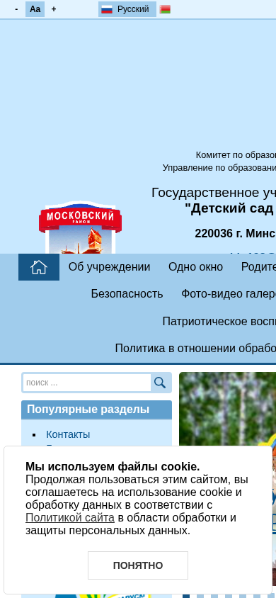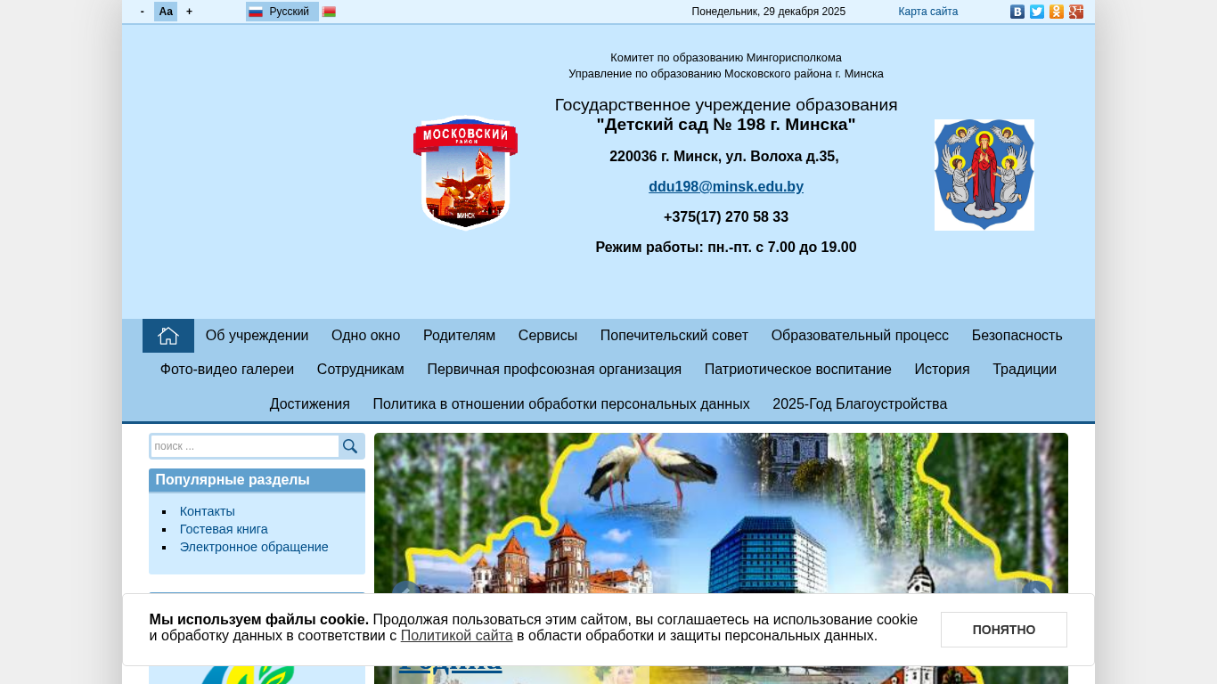 | AI-анализ | --- This online resource is the official website of the State Educational Institution "Childcare Center No. 198 of Minsk". It is operated by the Education Department of the Moscow District Administration of Minsk City. The website provides information about the preschool, its location, contact details, working hours, and various services offered. The main focus is on early childhood education and development. The site includes sections on the educational process, safety, staff, and parent services. It also features a news section, photo and video galleries, and a contact form. Cookies are used on the site, and visitors are required to agree to their usage and data handling according to the site's privacy policy. The site is primarily in Russian, with some sections available in Belarusian. |