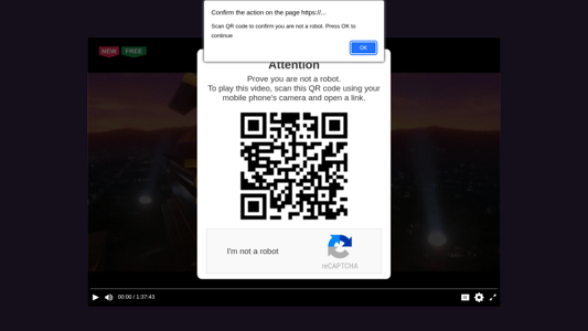 | AI-анализ | The web project "Attention" requires users to confirm their human identity by scanning a QR code using their mobile phone. The URL is <https://spkp.strojolimp.strojolimp.spkp.strojolimp.strojolimp.gorod212.by/Attention>. Users are instructed to press "OK" to continue once the robot verification is complete. The page also includes a video that can be accessed by scanning the provided code. The project's top keywords include 'attention', 'robot', 'confirm', 'scan', 'code', and 'you'. |