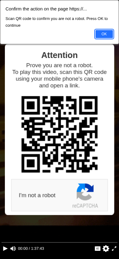 | AI-анализ | The website is a page requiring user confirmation to proceed, possibly for security reasons. It requests users to scan a QR code using their mobile phone and open the link to prove they are not a robot. The page title is "Attention" and the video on the page shows a countdown timer of 1 minute and 37 seconds, with the text "Prove you are not a robot". Keywords associated with the page include "attention", "confirm", "robot", "scan", "code", and "you are". The top words on the page are "not", "robot", "attention", "confirm", "the", "scan", "code", "you", "are", "this", "action", "page", "https", "press", "continue", "prove", "play", "video", "using", and "your". The domain name is spkp.spk |