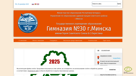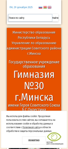 | AI-анализ | This website belongs to Gimnaziya №30 g.Minsk named after Hero of the Soviet Union B.S.Okretsina. The title reflects the name and status of the educational institution. The description includes various topics related to the school such as its history, goals, academic offerings, and support services for students. Keywords suggest that the website provides information on the educational process, documents, and various forms of assistance. The top words indicate a focus on the school, its location in Minsk, and educational matters. The menu includes sections about the school, life at the school, services, and contacts. The website appears to offer a virtual tour, leadership information, teacher information, student information, and various documents. The school also mentions a social-pedagogical support and psychological help, a student body, a materials and technology base, a guardian council, a library, safety rules, community |