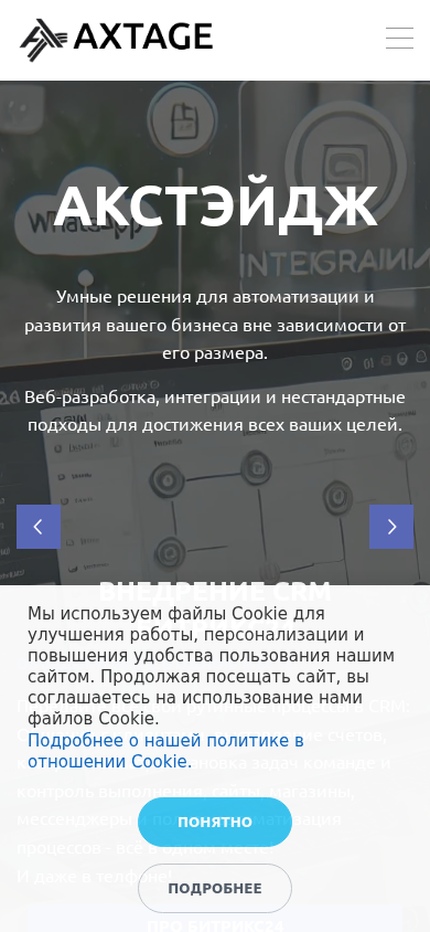 | AI-анализ | The web project AxtageBY focuses on providing smart solutions for business automation and growth regardless of its size. It offers web development, integration, and custom approaches to help clients achieve their goals. The project emphasizes the importance of having a website to showcase and tell clients about a business, even if it is a simple one-page site. AxtageBY also promotes the implementation of CRM Bitrix24 to manage and streamline various business processes, including customer communication, billing, task assignment, and team management, all in one place. The website provides information about the use of cookies and their settings on its sites. |