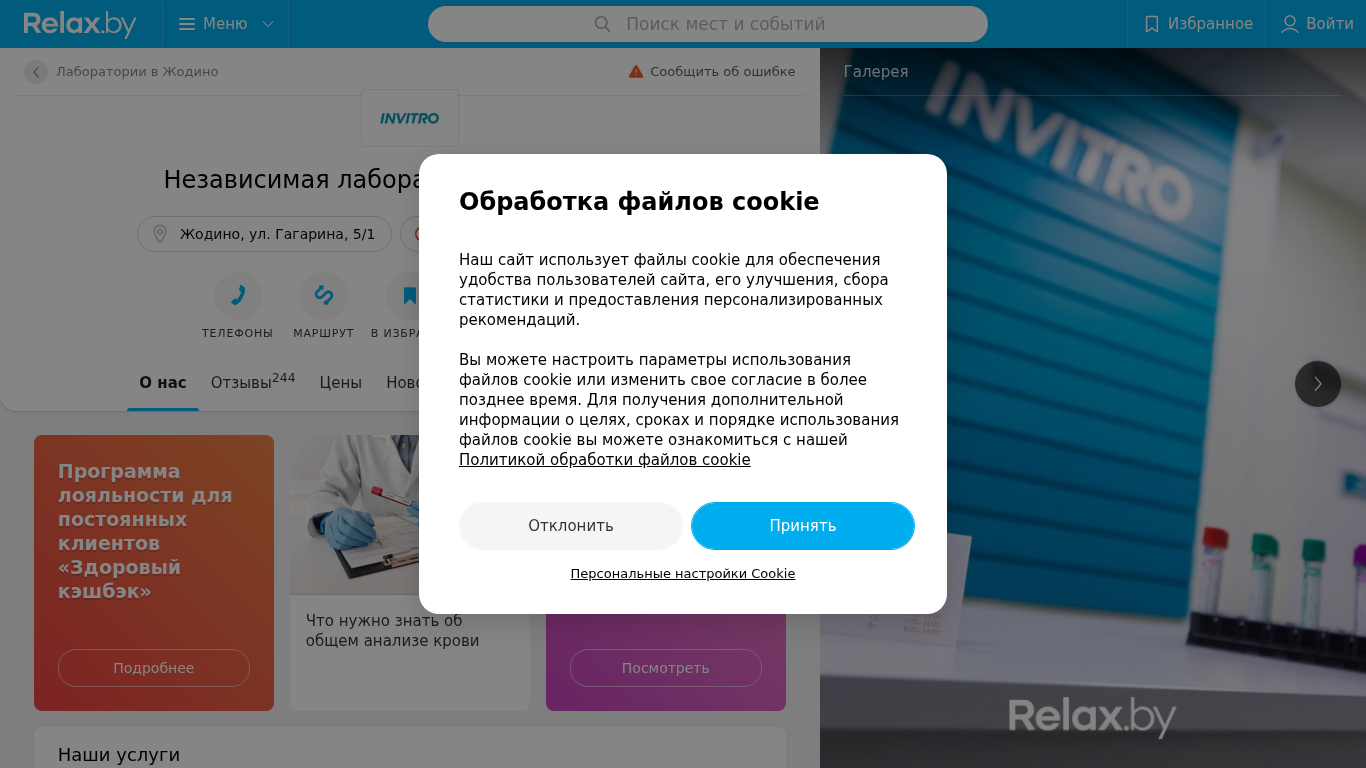 | SEO-описание | Независимая лаборатория ИНВИТРО в Жодино – отзывы, телефоны, график работы и карта проезда на Relax.by |