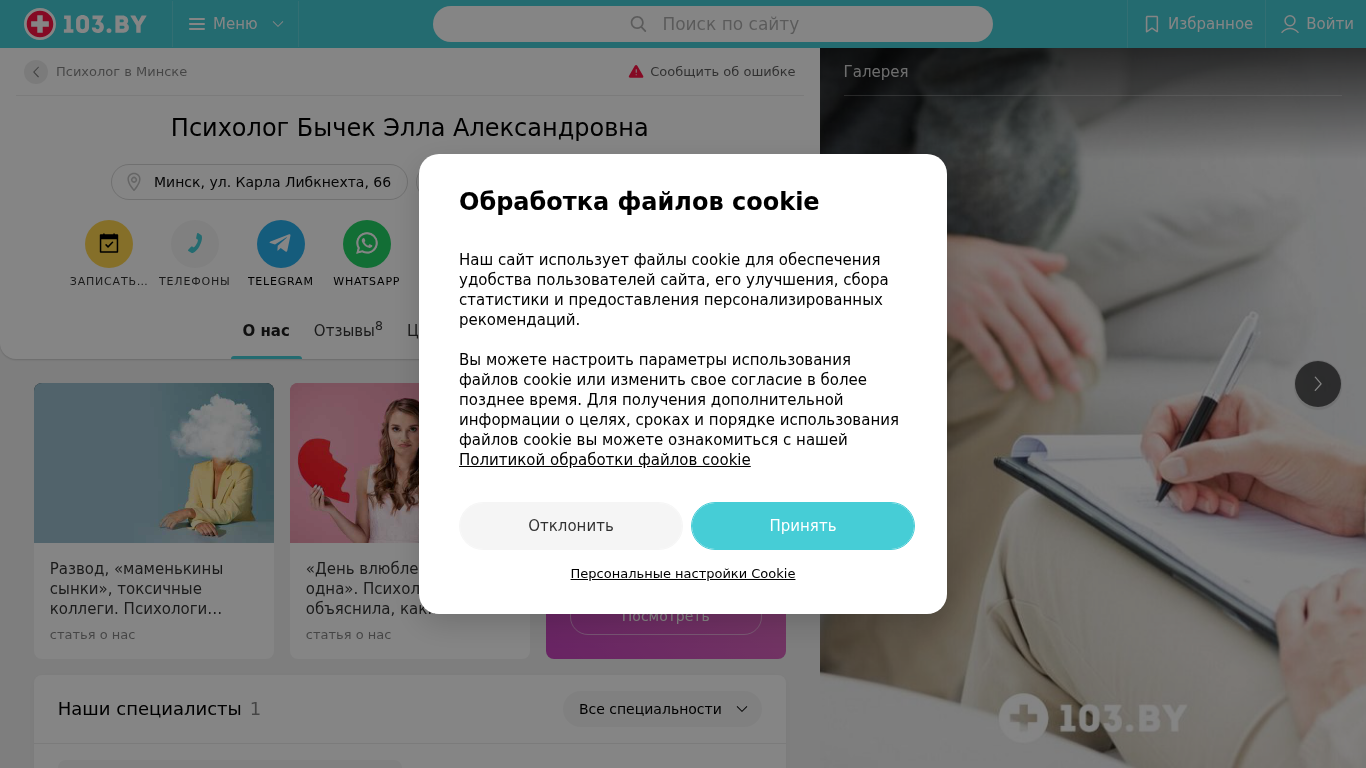 | SEO-описание | Психолог Бычек Элла Александровна Минск ул. Карла Либкнехта 66 – телефоны, время работы, отзывы и схема проезда в каталоге медицинского портала 103.by. |