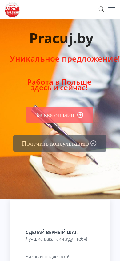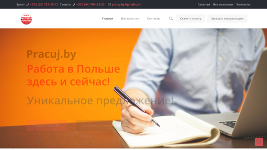| AI-анализ | Портал Pracuj.by предлагает официальные услуги по трудоустройству в Польше для белорусов. Он предоставляет комплексную помощь по получению виз и оформлению документации. Сайт предлагает бесплатный консультацию и контактные данные офисов в Бресте, Гомеле и Минске. Компания специализируется на услугах по подбору персонала для работы в Европейском союзе, особенно в Польше, Чешской Республике и других странах ЕС. Сайт предлагает широкий спектр интересных вакансий и профессиональную поддержку при оформлении документации. Услуга акцентирует внимание на безопасной кооперации и предлагает бесплатную консультацию с специалиста. Предпочтительным методом общения является использование операторов мобильных сетей Viber, WhatsApp и Telegram. Сайт также предоставляет информацию о лучших вакансиях месяца по отзывам сотрудников. |