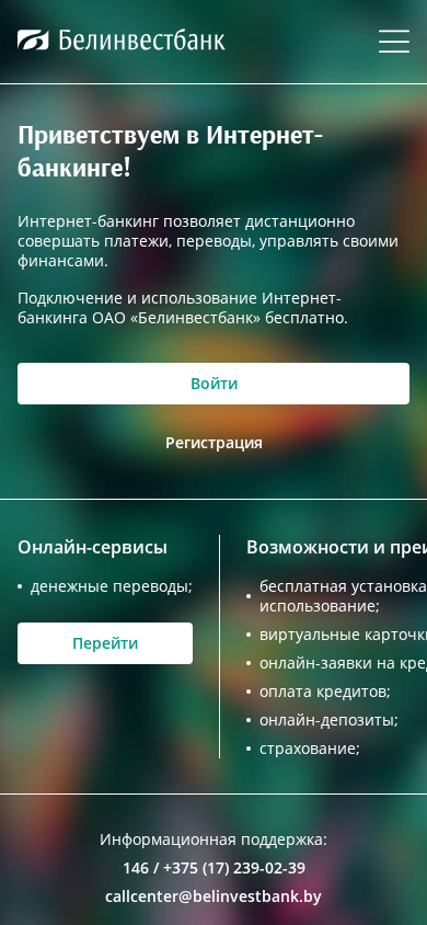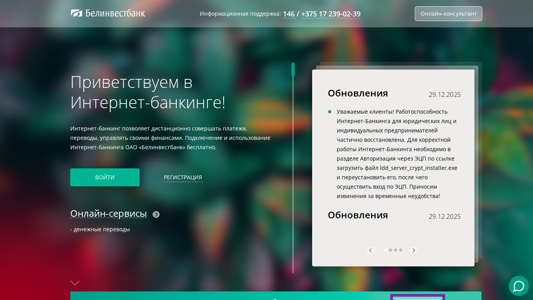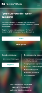 Этот онлайн-ресурс является платформой интернет-банкинга Белинвестбанка. Интернет-банкинг позволяет пользователям совершать платежи, переводы и управлять своими финансами на расстоянии. Доступ к и использование услуги интернет-банкинга Белинвестбанка бесплатно. Пользователи могут войти или зарегистрироваться для использования онлайн-сервисов, таких как переводы денег. Особенности и преимущества интернет-банкинга Белинвестбанка включают в себя виртуальные карты Cashelkoff, онлайн-заявки на кредит и карточные услуги, оплату по кредиту, онлайн-счета, страхование, выгодные курсы обмена валют между картами, полный контроль над управлением картой, удобную корзину для платежей, автоматические уведомления о просроченных счетах, возможность привязки еще одной банковской карты и онлайн-уведомления по SMS. Обновление: 29.12.2025 - Функциональность интернет-банкинга Белинвестбанка для юридических лиц и индивидуальных предпринимателей частично восстановлена. Для обеспечения корректной работы пользователи должны