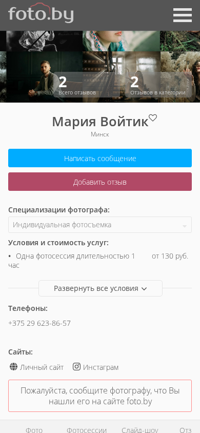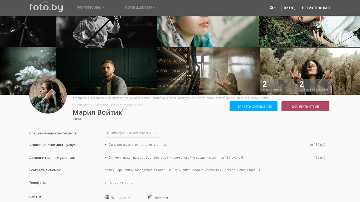 | SEO-описание | Фотографии в категории "Индивидуальная фотосъемка". Сайт фотографа Мария Войтик. Я работаю как фотограф для индивидуальной фотосъемки в городах Минск, Молодечно, Барановичи |