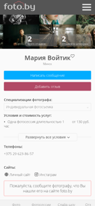| AI-анализ | Проект веб-сайта предназначен для фотографа Марии Войтик из Минска, Беларусь. Сайт сосредоточен на индивидуальных сессиях фотографирования. Используемые ключевые слова для этого проекта: "фотографии", "фотограф", "фотографы", "Минск", "индивидуальная", "фото", "Мария", "Войтик". Сайт предлагает услуги по фотографированию в категориях индивидуальных сессий в городах Минск, Молодечно и Барановичи. |