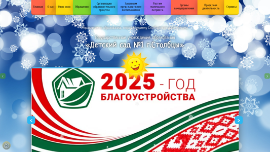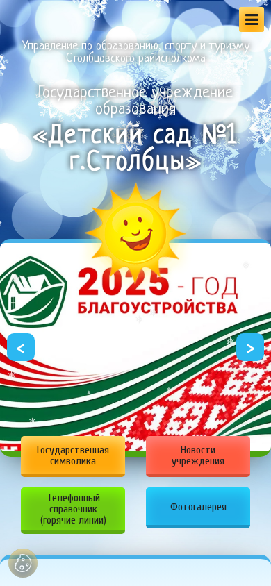 | AI-анализ | The website is for a kindergarten in the city of Stolbtsy, Belarus, titled "Детский сад №1 г.Столбцы" (Kindergarten No.1 in Stolbtsy). The description mentions various aspects of the kindergarten, including its administration, functions, and services. Keywords include "учреждения" (institutions), "образования" (education), and "детский сад" (kindergarten), with "столбцы" (Stolbtsy) appearing frequently as well. The website features news, a staff directory, a map, and a section for parents with information on enrollment, safety, and nutrition. Other topics covered include the kindergarten's history, policies on data processing, and various educational and social projects. The website also includes a phone directory and |