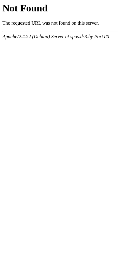 Сайт является стандартной страницой ошибки 404 для сервера, расположенного по адресу spas.ds3.by, работающего на Debian с Apache 2.4.52. Страница информирует пользователя о том, что запрошенный URL не найден на сервере. Не предоставляется дополнительная информация.