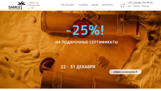 | SEO-описание | САМУИ СПА. Уникальный Тайский SPA-салон SAMUI. Купить подарочный сертификат в СПА в Минске. СПА-программы на двоих, для семьи. ✔ Записаться на SPA-процедуры по телефону ☎ (29/44) 793 93 93 |