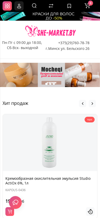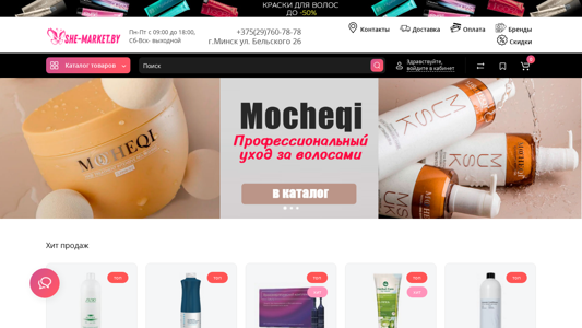 The web project She-market.by is an online store specializing in cosmetics and perfumery. It offers a vast assortment of professional products in various categories. The store is open from Monday to Saturday, 9:00 AM to 6:00 PM, with Sunday being a day off. Customers can contact the business at +375(29)760-78-78 in Minsk, located at ul. Bel'skogo 26. The website provides delivery services and accepts payments. Brands and discounts are featured, with a catalog of products available for perfumery, makeup, hair care, body care, and accessories for men. Categories include hair care, skincare, lip care, body care, and makeup accessories. Products range from cleansers, lotions, masks, and oils to hair dyes, styling tools
