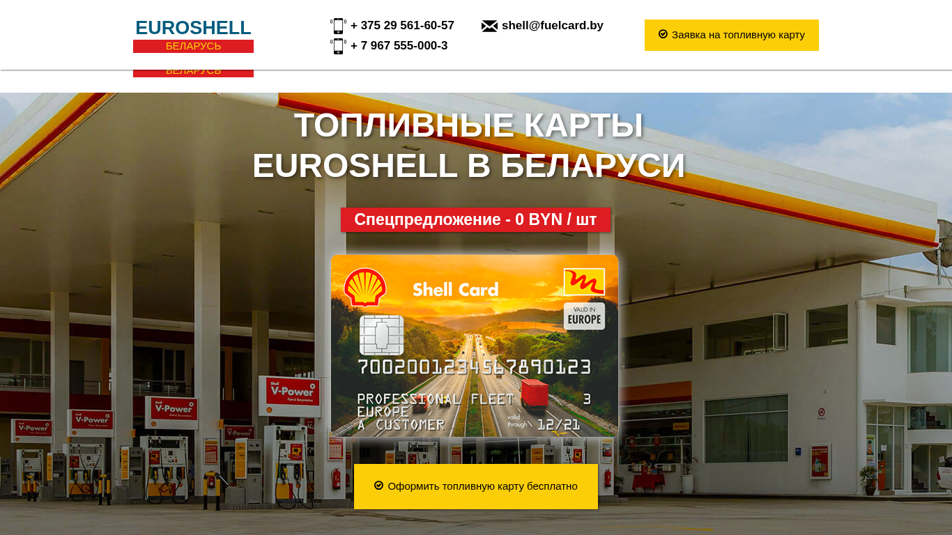 | SEO-описание | Топливные карты EuroShell (ЕвроШелл) в Беларуси для Юридических лиц и ИП. Здесь Вы можете Заказать Карты SHELL в Республике Беларусь. |