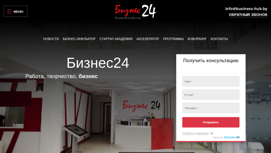 | AI-анализ | --- This online resource, titled "Коворкинг Бизнес24," offers workspace rentals in the center of Grodno. Convenient workspaces and fast internet enable productive work and business setup. The website provides information on the business incubator, programs, room rentals, a public offer contract, tariffs, and contacts. The business incubator offers startup academy and accelerator programs. The tariffs include a "Remote Student" plan with participation in business incubator events, investment sessions, and DemoDays. One hour of mentor support for resident projects is also included. The comfortable office is located in the city center, with options for buhgalterskoe soprovedenie (business consulting). The website includes a form for consultation requests. The domain is business-hub.by. |