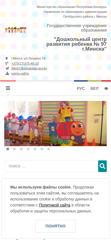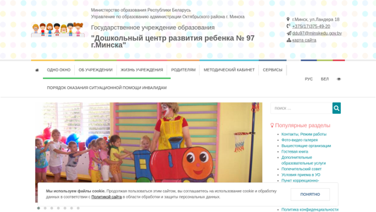 | AI-анализ | The website <Детский сад 97> is a government educational institution based in the October district of Minsk, Belarus. The title of the website is "Детский сад 97" and it is part of the Ministry of Education of the Republic of Belarus. The website provides information about the kindergarten, its location, schedule, and contact details. Visitors can find details about the admission process, administrative procedures, and electronic services. The website also includes information about the institution's leadership, mission, and policies, as well as various initiatives and programs. Topics covered include child development, education, and care. The website features sections on safety and emergency preparedness, as well as resources for parents and guardians. The content is organized into a clear and straightforward layout, with a focus on accessibility and user-friendliness. The website is operated by the State Educational |
