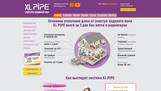 | AI-анализ | <-- The website is dedicated to the sale of electro-water heating systems XL PIPE in the city of Novopolotsk, Belarus. The title of the website is "Отопление дома от электро-водяного пола XL PIPE купить в г. Новополоцк" which translates to "Buying home heating from electro-water XL PIPE in the city of Novopolotsk." The description provides information about the benefits of the XL PIPE system, such as quick installation within three days without a boiler or radiators, lower capital costs, energy savings, and the unique repairable warm floor feature. The system is made of a polyethylene tube with a diameter of 20 mm, filled with liquid and a heating cable. It comes in nine sizes ranging from 7 to 84 meters long and can heat spaces |